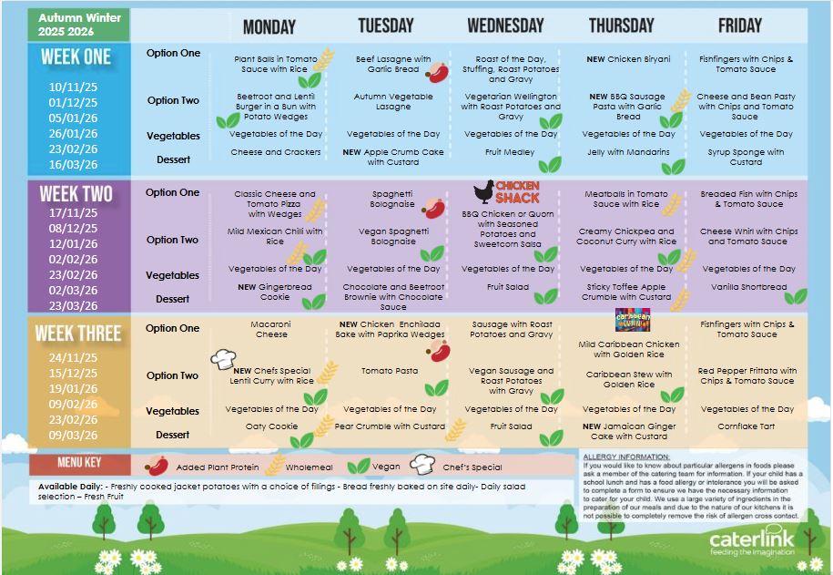 We are very fortunate to have nutritious meals prepared daily on the school premises. School hot dinners are planned to ensure children receive all the necessary nutrition that they need as they grow and develop.